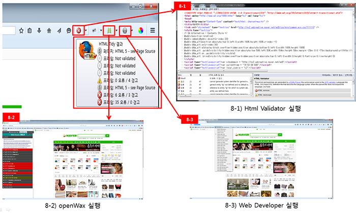 1-5) 부가기능 바로가기 아이콘 추가 : 상단메뉴에서 [보기 – 도구 모음 – 사용자 지정] 화면에서 부가기능(예: Html Validator) 아이콘을 우클릭하여 “도구 상자에 추가” 클릭